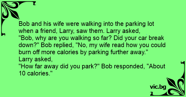 "Bob, why are you walking so far? Did your car break down?" Bob replied, "No, my wife read how you could burn off more calories by parking further away."
