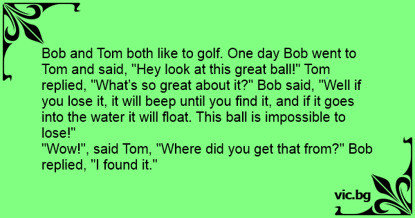 Bob and Tom both like to golf. One day Bob went to Tom and said, "Hey look at this great ball!" Tom replied, "What’s so great about it?" Bob said, "Well if you lose it, it will beep until you find it, and if it goes into the water it will float. This ball is impossible to lose!"