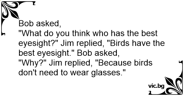 "What do you think who has the best eyesight?" Jim replied, "Birds have the best eyesight." Bob asked,