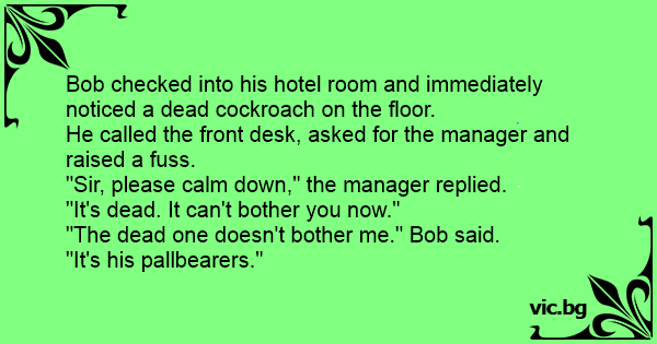 Bob checked into his hotel room and immediately noticed a dead cockroach on the floor.