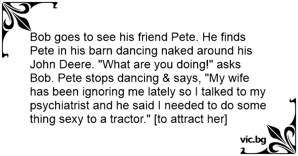 Bob goes to see his friend Pete. He finds Pete in his barn dancing nакеd around his John Deere. "What are you doing!" asks Bob. Pete stops dancing & says, "My wife has been ignoring me lately so I talked to my psychiatrist and he said I needed to do some thing sеxy to a tractor." [to attract her]
