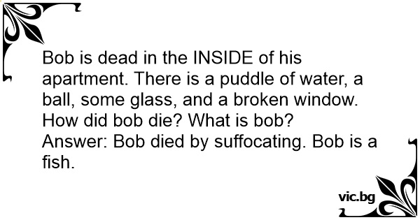 Answer: Bob died by suffocating. Bob is a fish.