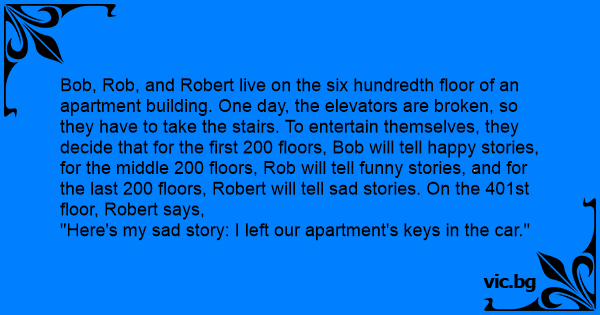 Bob, Rob, and Robert live on the six hundredth floor of an apartment building. One day, the elevators are broken, so they have to take the stairs. To entertain themselves, they decide that for the first 200 floors, Bob will tell happy stories, for the middle 200 floors, Rob will tell funny stories, and for the last 200 floors, Robert will tell sad stories. On the 401st floor, Robert says,