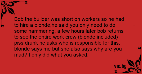 Bob the builder was short on workers so he had to hire a blonde,he said you only need to do some hammering. a few hours later bob returns to see the entire work crew (blonde included) рiss drunк he asks who is responsible for this. blonde says me but she also says why are you mad? I only did what you asked.
