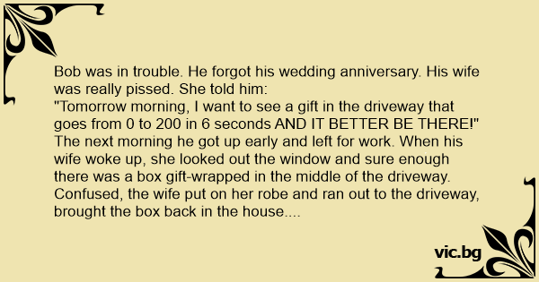 Bob was in trouble. He forgot his wedding anniversary. His wife was really рissеd. She told him: