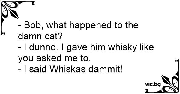 - Lskling, vad är det för fel pà katten? Den är ju helt borta - Det vet jag inte. Jag gav den lite whiskey, precis som du sa att jag skulle... - Jag sa whiskas, din korkskalle!