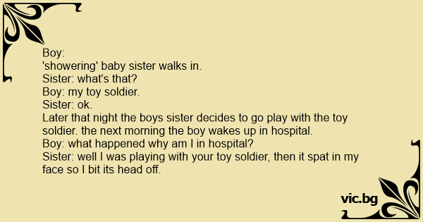Sister: well I was playing with your toy soldier, then it spat in my face so I bit its head off.