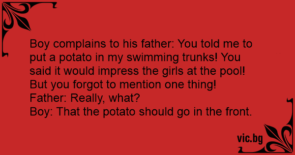 Boy complains to his father: You told me to put a potato in my swimming trunks! You said it would impress the girls at the pool! But you forgot to mention one thing!