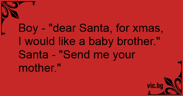 A little kids sends a letter to Santa that says: "Dear Santa I want a brother for Christmas." Santa writes back, "Dear Timmy send me me your mommy."