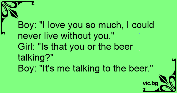 Мъжът: "Обичам те! " Жената: " Ти ли го казваш или бирата? " Мъжът: " Аз го казвам на бирата."