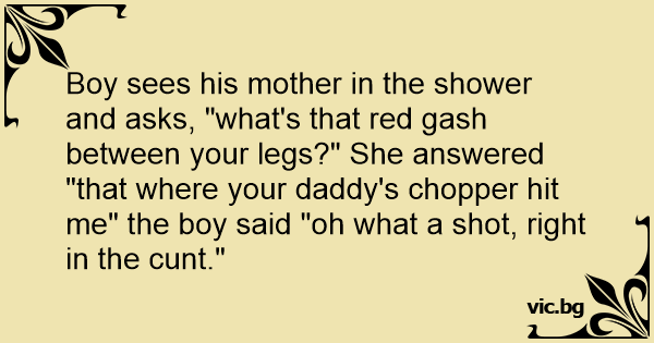 Boy sees his mother in the shower and asks, "what's that red gаsh between your legs?" She answered "that where your daddy's chopper hit me" the boy said "oh what a shot, right in the сunт."