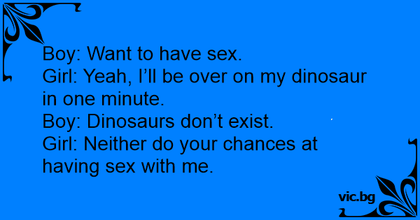 Boy: Want to have sеx.<br />Girl: Yeah, I’ll be over on my dinosaur in one minute.<br />Boy: Dinosaurs don’t exist.<br />Girl: Neither do your chances at having sеx with me.