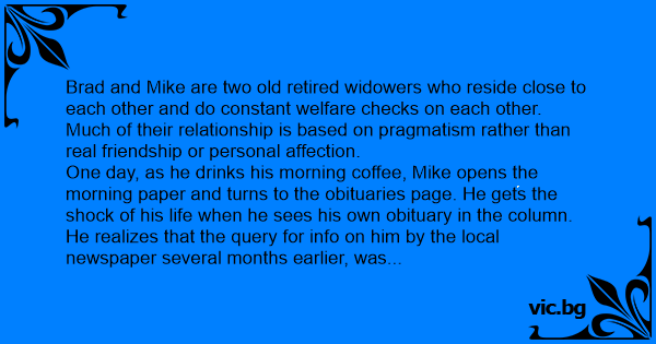 One day, as he drinks his morning coffee, Mike opens the morning paper and turns to the obituaries page. He gets the shock of his life when he sees his own obituary in the column. He realizes that the query for info on him by the local newspaper several months earlier, was in preparation for this event. He correctly surmises that it is a mistaken entry from their database.