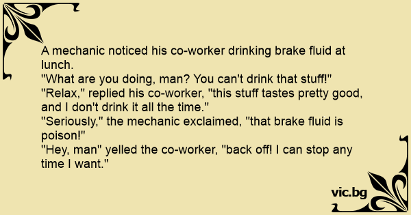 "Seriously," the mechanic exclaimed, "that brake fluid is poison!"