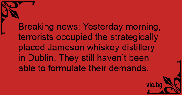 Breaking news: Yesterday morning, terrorists occupied the strategically placed Jameson whiskey distillery in Dublin. They still haven’t been able to formulate their demands.