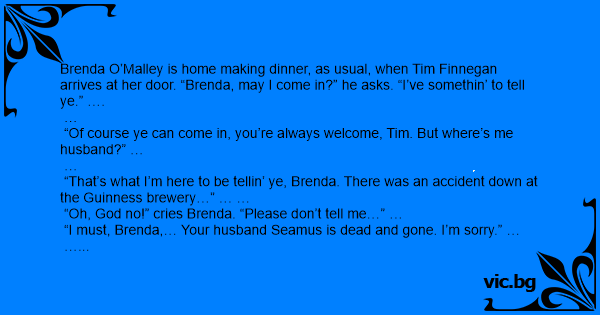 Brenda O’Malley is home making dinner, as usual, when Tim Finnegan arrives at her door. “Brenda, may I come in?” he asks. “I’ve somethin’ to tell ye.” ….