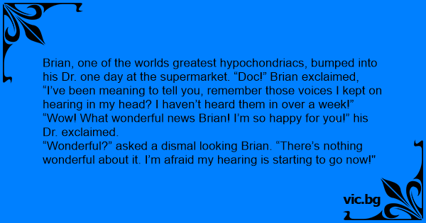 Brian, one of the worlds greatest hypochondriacs, bumped into his Dr. one day at the supermarket. “Doc!” Brian exclaimed, “I’ve been meaning to tell you, remember those voices I kept on hearing in my head? I haven’t heard them in over a week!”