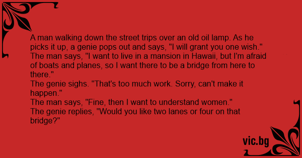 While walking along a beach, a man finds a lamp and rubs it off. A genie appears and offers to grant the man one wish.