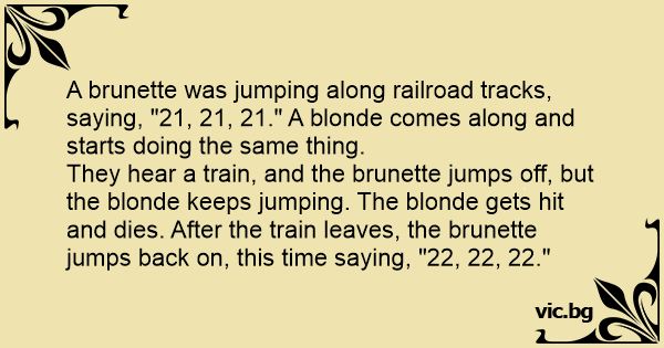 A brunette was jumping along railroad tracks, saying, "21, 21, 21." A blonde comes along and starts doing the same thing.