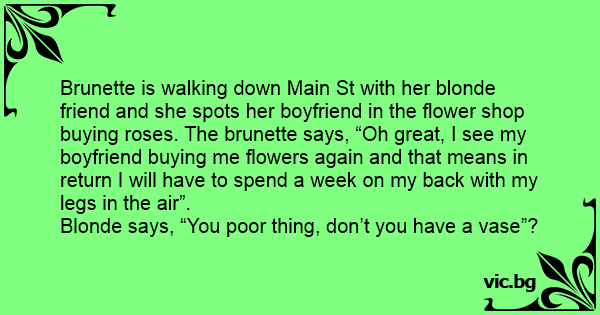 Brunette is walking down Main St with her blonde friend and she spots her boyfriend in the flower shop buying roses. The brunette says, “Oh great, I see my boyfriend buying me flowers again and that means in return I will have to spend a week on my back with my legs in the air”.