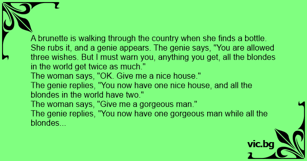 A brunette is walking through the country when she finds a bottle. She rubs it, and a genie appears. The genie says, "You are allowed three wishes. But I must warn you, anything you get, all the blondes in the world get twice as much."