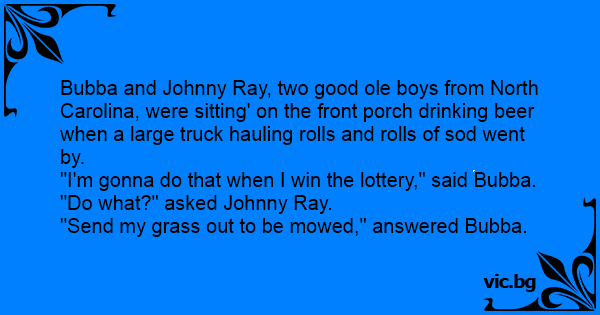 Bubba and Johnny Ray, two good ole boys from North Carolina, were sitting' on the front porch drinking вееr when a large truck hauling rolls and rolls of sоd went by.