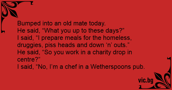 I said, “I prepare meals for the homeless, druggies, рiss heads and down ‘n’ outs.”