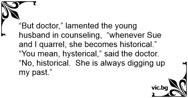 “But doctor,” lamented the young husband in counseling, “whenever Sue and I quarrel, she becomes historical.” “You mean, hysterical,” said the doctor.