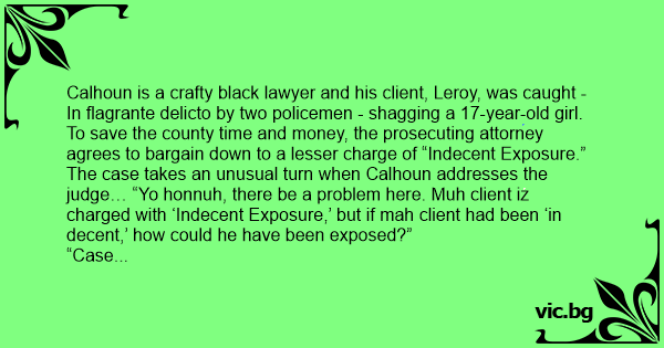 The case takes an unusual turn when Calhoun addresses the judge… “Yo honnuh, there be a problem here. Muh client iz charged with ‘Indecent Exposure,’ but if mah client had been ‘in decent,’ how could he have been exposed?”