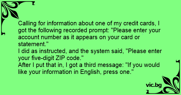 Calling for information about one of my credit cards, I got the following recorded prompt: "Please enter your account number as it appears on your card or statement."