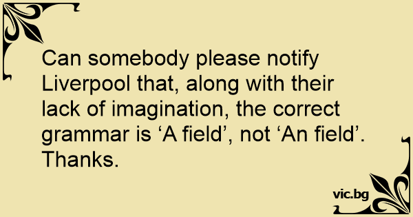 Can somebody please notify Liverpool that, along with their lack of imagination, the correct grammar is ‘A field’, not ‘An field’. Thanks.