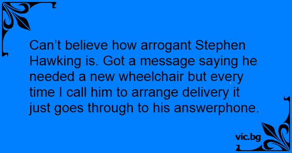 Can’t believe how arrogant Stephen Hawking is. Got a message saying he needed a new wheelchair but every time I call him to arrange delivery it just goes through to his answerphone.