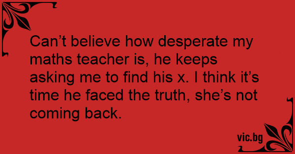 Can’t believe how desperate my maths teacher is, he keeps asking me to find his x. I think it’s time he faced the truth, she’s not coming back.