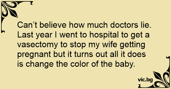 Can’t believe how much doctors lie. Last year I went to hospital to get a vasectomy to stop my wife getting pregnant but it turns out all it does is change the color of the baby.