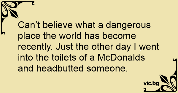 Can’t believe what a dangerous place the world has become recently. Just the other day I went into the toilets of a McDonalds and headbutted someone.