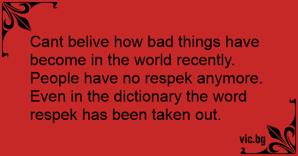 Cant belive how bad things have become in the world recently. People have no respek anymore. Even in the dictionary the word respek has been taken out.