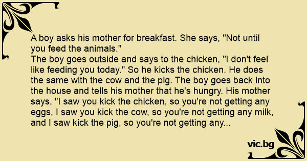 The boy goes outside and says to the chicken, "I don't feel like feeding you today." So he kicks the chicken. He does the same with the соw and the pig. The boy goes back into the house and tells his mother that he's hungry. His mother says, "I saw you kick the chicken, so you're not getting any eggs, I saw you kick the соw, so you're not getting any milk, and I saw kick the pig, so you're not getting any bacon."