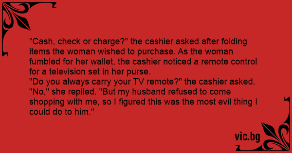 "Cash, check or charge?" the cashier asked after folding items the woman wished to purchase. As the woman fumbled for her wallet, the cashier noticed a remote control for a television set in her purse.