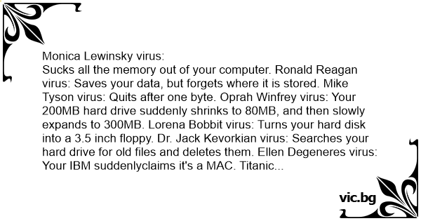 Sucks all the memory out of your computer. Ronald Reagan virus: Saves your data, but forgets where it is stored. Mike Tyson virus: Quits after one byte. Oprah Winfrey virus: Your 200MB hard drive suddenly shrinks to 80MB, and then slowly expands to 300MB. Lorena Bobbit virus: Turns your hard disk into a 3.5 inch floppy. Dr. Jack Kevorkian virus: Searches your hard drive for old files and deletes them. Ellen Degeneres virus: Your IBM suddenlyclaims it's a MAC. Titanic virus: Makes your whole computer go down. Disney virus: Everything in the computer goes Goofy. Prozac virus: Screws up your RAM but your processor doesn't care. Sharon Stone virus: Makes a huge initial impact, then you forget it's there. Tim Allen virus: Appears helpful, only to destroy your hard drive upon contact. HBO virus: Runs the same programs over and over, week after week after week. Wооdy Allen virus: Bypasses the motherboard and turns ona daughter card. NFL Blackout virus: Will only let you run progams on a remote terminal that's more than 75 miles away. Linda Tripp virus: Makes copies of your personal files and forwards them to the authorities. Bill Clinton virus: Won't let you query the system for information. Rush Limbaugh virus: Biases everything to the right. Ken Starr virus: Expands a focused search of a specific file into a global interregation of every existing file. Creates links between unrelated data. Works extremelyslow while searching and compiling results. Al Gore virus: Runs quietly in background mode but doesn't appear to really do much of anything. Saddam Hussein virus: Won't let you into any of your programs. Tonya Harding virus: Turns your .BAT files into lethal weapons. George Michael virus: Runs its course, occasionally releasing excess data buildup. Joey Buttafuoco virus: Only attacks minor files. Jerry Seinfeld virus: Program about nothing that exits when you're really enjoying it. David Caruso NYPD Blue virus: After running successfully for a while, it exits the program it was inand never works again. Рее Wee Herman virus: Exposes yourconfidential files to everyone. X-files virus: All your Icons start shape shifting. Spice Girl virus: Has no real function, but makes a pretty desktop. AT&T virus: Every 3 minutes it tells you what great service you are getting. Arnold Schwarzenegger virus: Terminates and stays resident. It'll be back.