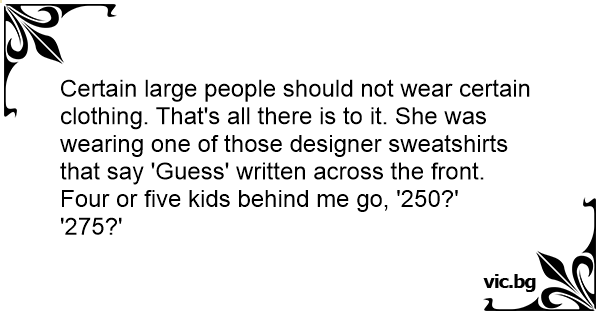 Certain large people should not wear certain clothing. That's all there is to it. She was wearing one of those designer sweatshirts that say 'Guess' written across the front. Four or five kids behind me go, '250?'
