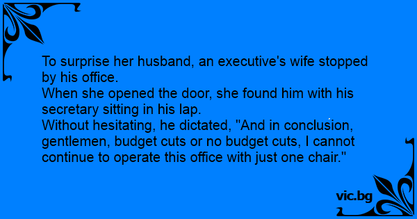Con la idea de darle una sorpresa a su marido, una señora pasa a la oficina de su esposo sin avisar. Al abrir la puerta lo encontró con su secretaria sentada en su regazo. Sin titubear, el marido...