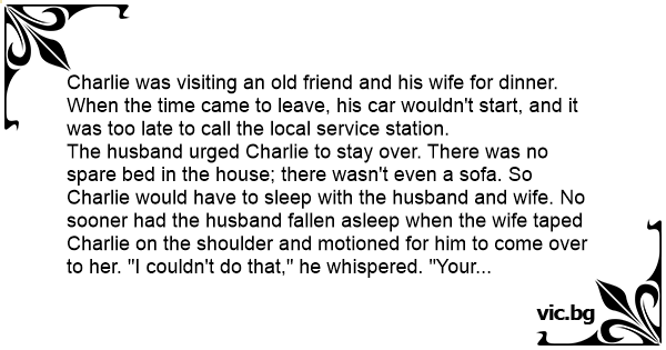 The husband urged Charlie to stay over. There was no spare bed in the house; there wasn't even a sofa. So Charlie would have to sleep with the husband and wife. No sooner had the husband fallen asleep when the wife taped Charlie on the shoulder and motioned for him to come over to her. "I couldn't do that," he whispered. "Your husband is my best friend!" "Listen, sugar," she whispered back, "there ain't nothing in the whole wide world could wake hime up now." "I can't believe that," Charlie said. "Certainly if I get on top of you and sсrеw you, he'll wake up won't he? "Sugar, he certainly won't. If you don't believe me, pluck a hair out of his аsshоlе and see if that wakes him." Charlie did just that. He was amazed when the husband remained asleep. So he climbed over to the wife's side of the bed and fuскеd her.