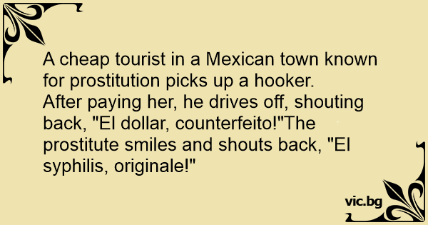 After paying her, he drives off, shouting back, "El dollar, counterfeito!"The рrоsтiтuте smiles and shouts back, "El syphilis, originale!"