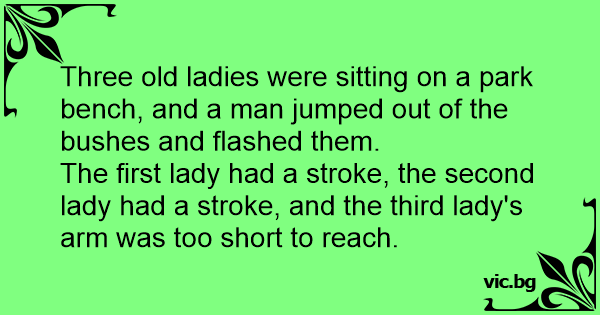 Three old ladies were sitting on a park bench, and a man jumped out of the bushes and flashed them.