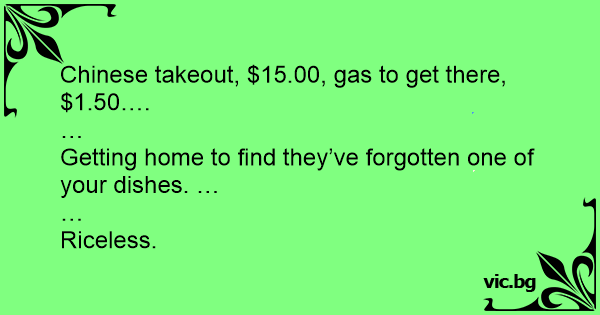 Chinese takeout, $15.00, gas to get there, $1.50….
