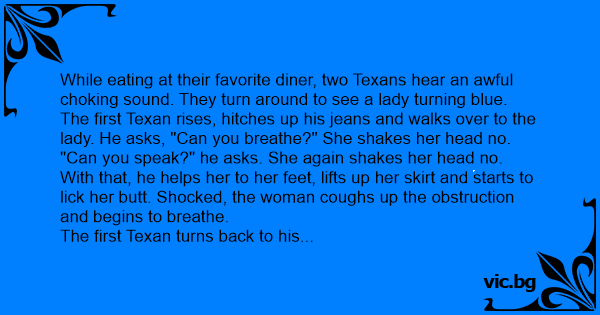 The first Texan rises, hitches up his jeans and walks over to the lady. He asks, "Can you breathe?" She shakes her head no. "Can you speak?" he asks. She again shakes her head no.