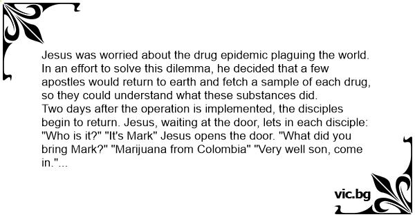 Jesus was worried about the drug epidemic plaguing the world. In an effort to solve this dilemma, he decided that a few apostles would return to earth and fetch a sample of each drug, so they could understand what these substances did.
