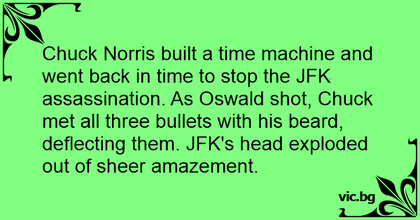 Chuck Norris built a time machine and went back in time to stop the JFK assassination. As Oswald shot, Chuck met all three bullets with his beard, deflecting them. JFK's head exploded out of sheer amazement.
