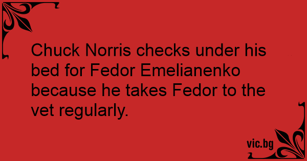 Chuck Norris checks under his bed for Fedor Emelianenko because he takes Fedor to the vet regularly.