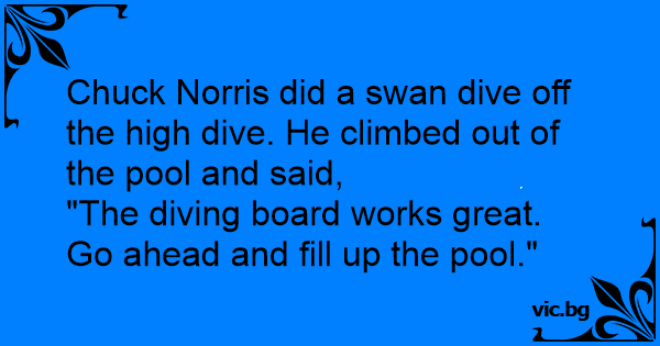 Chuck Norris did a swan dive off the high dive. He climbed out of the pool and said,
